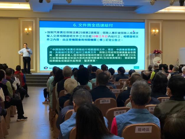 民政局長姜淋煌表示,據統計本市調解案件中,交通事故為最大宗之案件類型,故本次大會邀請到財團法人汽車交通事故特別補償基金游斯然講師,講授「強制險如何保障車禍受害人」之相關課程,講師透過實際案例解析及調解相關法令之運用分析車禍事故中兩造雙方之權益及保障。